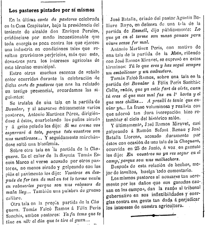 El relato no tiene desperdicio: gira en torno a discusiones por talas irregulares realizadas en distinats partidas del término municipal (Bovalar, la Choquera, La Mota, Ramell, Fadrell) con graves acusaciones, insultos y amenazas entre los pastores, citados con nombres y apellidos: