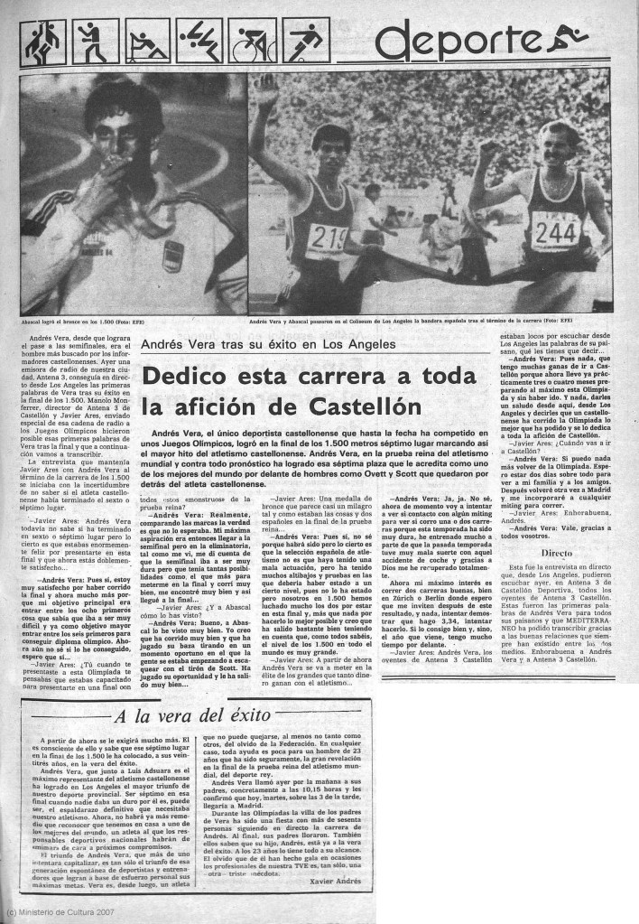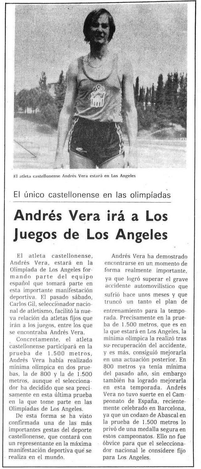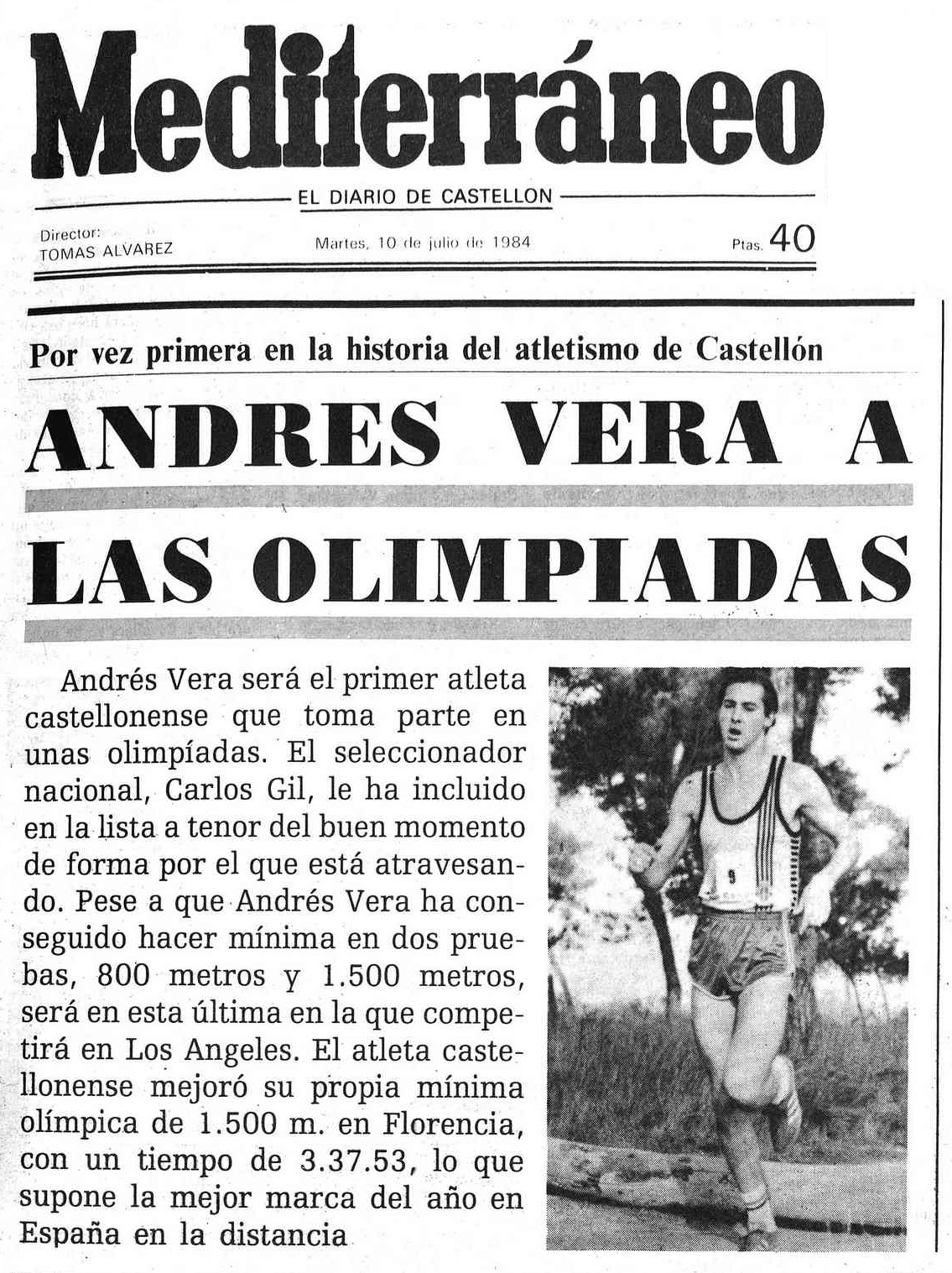 En el verano de 1984, el atletismo se hace un hueco inédito como primera noticia de portada en Mediterráneo. El motivo es sencillo: Andrés Vera Llorens ha hecho historia al convertirse en el primer atleta castellonense que tomará parte en unos Juegos Olímpicos, la cita principal del deporte global. Con el billete para Los Ángeles’84 en la mano gracias a una mínima de 3 minutos, 37 segundos y 53 milésimas, obtenida en una prueba en Florencia (Italia). El 27 de julio, Vera estará en la ceremonia inaugural en la ciudad californiana.