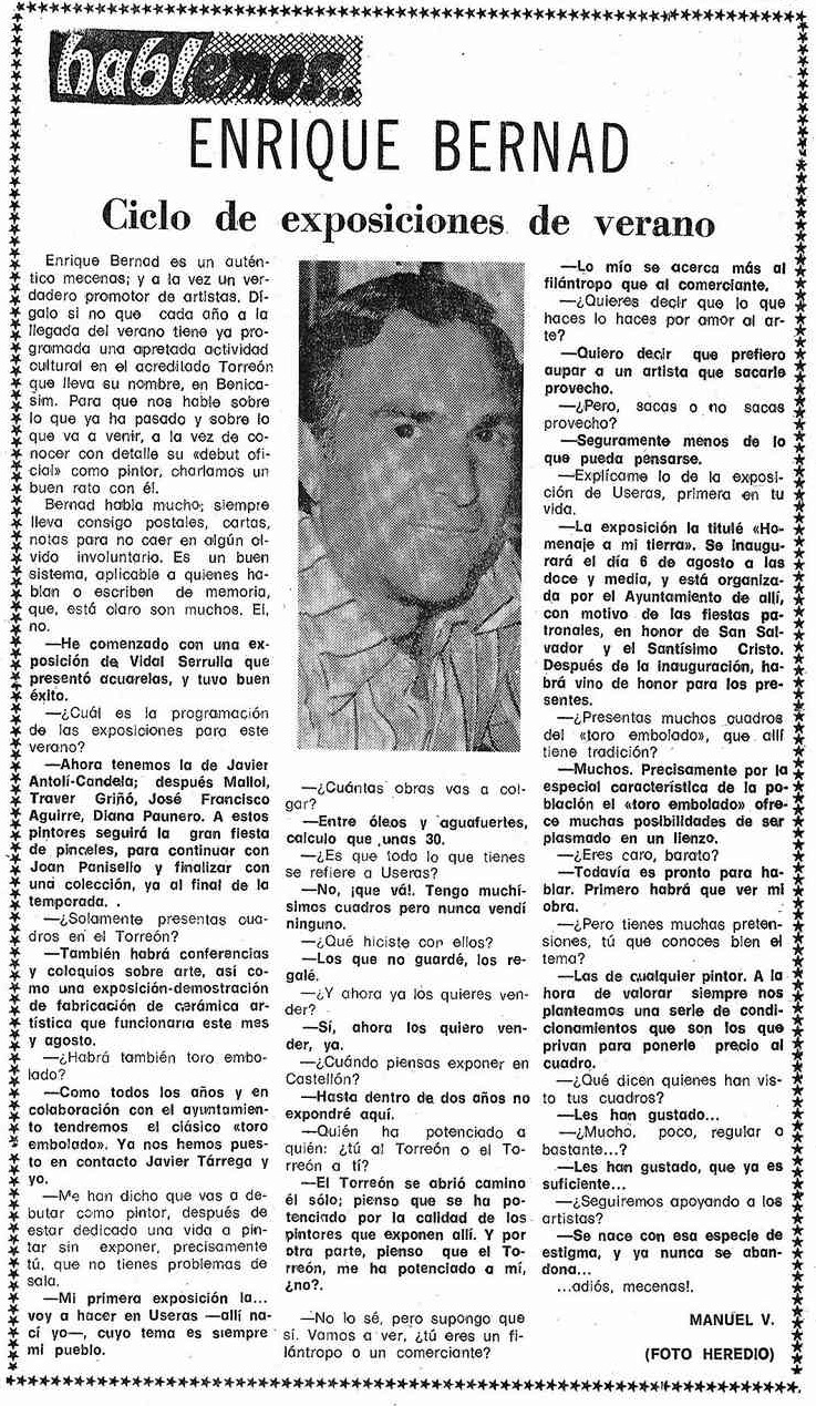 En el verano de 1979, el Torreón Bernad lleva ya tres lustros funcionando como centro cultural frente a la Torre Sant Vicent de Benicàssim. Su creador, Enrique Bernad Escrig (aquí, unas notas biográficas por Salvador Bellés) es entrevistado por Manuel Vellón para Mediterráneo. Con 41 años, el artista y mecenas nacido en Les Useres había inaugurado su espacio cultural el 31 de mayo de 1964 y con él forjará una relación muy intensa con pintores como Francisco Vidal Serrulla, entre otros.