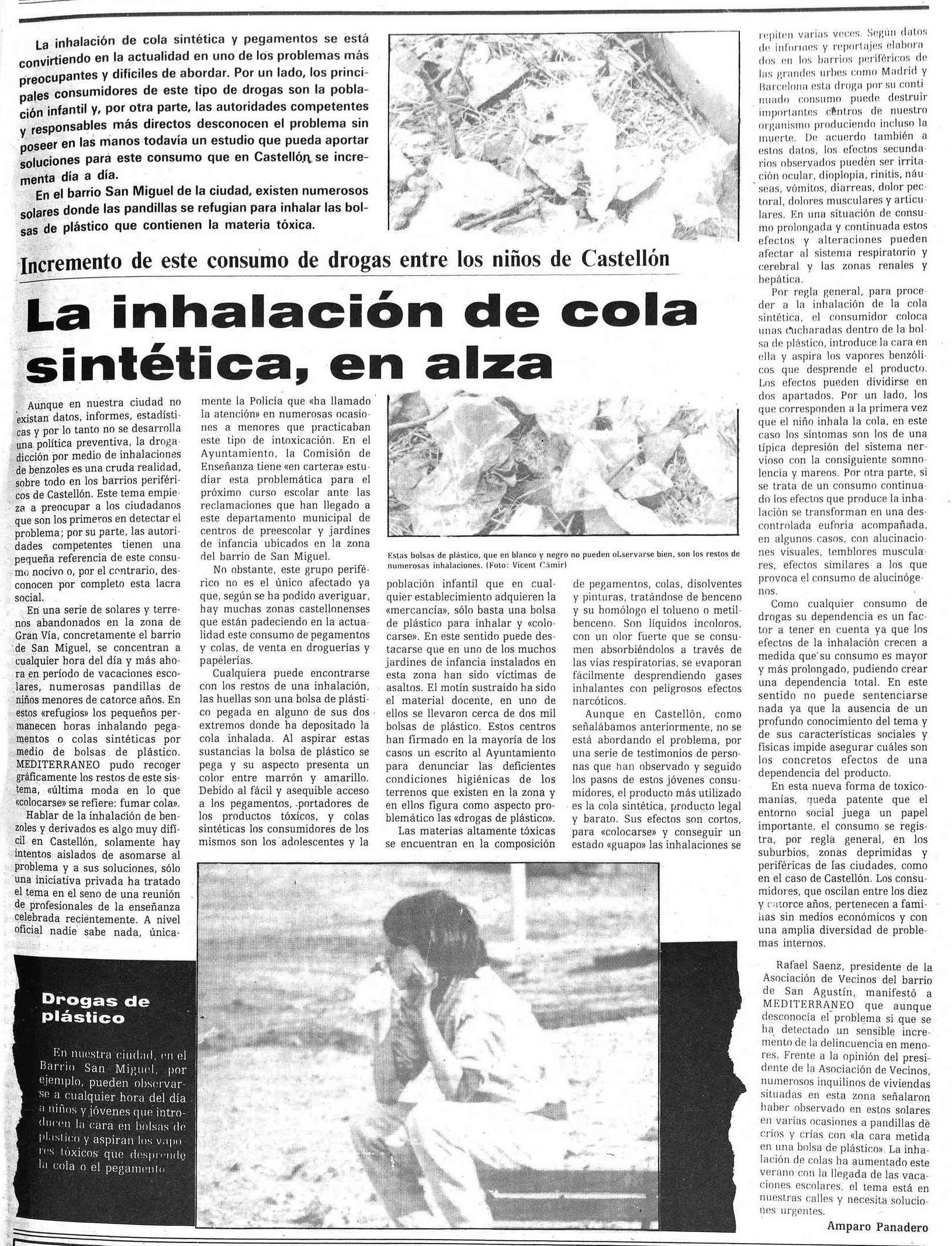 En el contexto del auge del consumo de drogas -duras y blandas- a mediados de los 80, se inscribe la tendencia al alza de la inhalación de pegamento (cola sintética) por parte de los niños en toda España. En Castellón, en el verano de 1984, Amparo Panadero informa desde Mediterráneo sobre el avance de su consumo entre grupos de niños en el barrio de San Miguel (al sur de la ciudad). donde «las pandillas se refugian para inhalar las bolsas de plástico que contienen la materia tóxica», según recoge en un amplio reportaje.