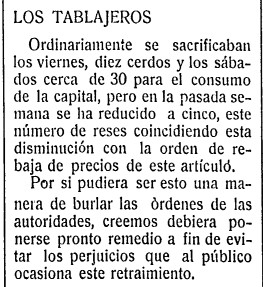 Una denuncia del periódico La Provincia Nueva, dirigido por Miguel C. Armengot, llama la atención en julio de 1924 sobre la reducción del número de cerdos que se sacrifican «para el consumo de la capital», que cuenta con unos 35.000 habitantes. El diario recela de la medida «por si pudiera ser esto una manera de burlar las órdenes de las autoridades». Y es que antes «ordinariamente se sacrificaban los viernes, diez cerdos y los sábados cerca de 30», y la mencionada disminución había coincidido «con la orden de rebaja de precios de este artículo».