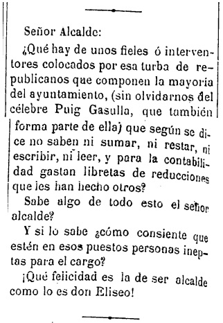 La virulencia de los ataques políticos a través de la prensa es muy habitual entre los periódicos de partido a finales del siglo XIX. Así, el semanario La Hoja Suelta, que se autodefine como «monárquica, liberal y católica» dirige al alcalde Eliseo Soler Breva una pregunta sobre los interventores del Ayuntamiento de Castellón, a juicio del periódico «colocados por esa turba de republicanos que componen la mayoría» en la corporación municipal. Sobre los aludidos, añaden que «según se dice no saben ni sumar, ni restar, ni escribir ni leer». La conclusión: son «personas ineptas para el cargo».