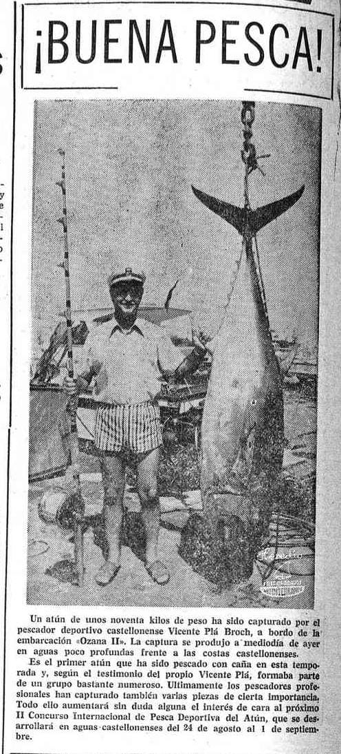 A finales de julio de 1974, Mediterráneo celebra de este modo la captura de un atún «de unos noventa kilos de peso», el primero pescado con caña en la temporada «en aguas poco profundas» frente a la costa castellonense. El protagonista de la captura, que posa ufano con su trofeo, es nada menos que el comerciante de naranja Vicente Pla Broch, que el 4 de noviembre del año siguiente, a apenas dos semanas de la muerte del dictador Francisco Franco, habría de ser nombrado alcalde de Castellón (ver sus notas biográficas, por Salvador Bellés).