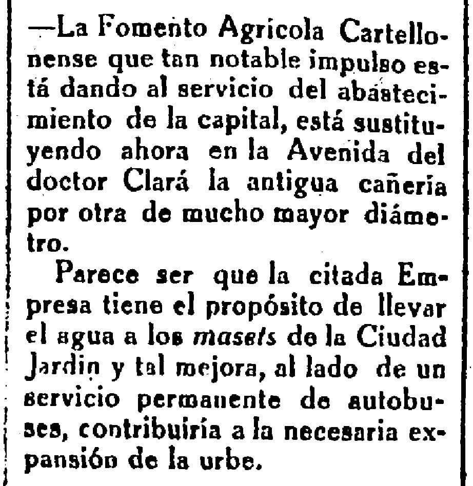 En el verano de 1929, Heraldo de Castellón se hace eco de la sustitución, en la avenida Doctor Clará, de una «antigua cañería por otra de mucho mayor diámetro», por parte de la empresa Fomento Agrícola Castellonense (hoy Facsa). Las obras responden al objetivo de «llevar el agua a los masets de la Ciudad Jardín», como se denomina la zona situada en la Gran Vía y la avenida Villarreal, en torno a la línea ferroviaria, plenamente consolidada como área de veraneo de muchas familias. La mejora, subraya el periódico, «contribuiría a la necesaria expansión» de la ciudad junto con un servicio «permanente» de autobuses.