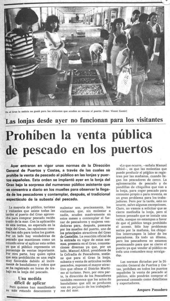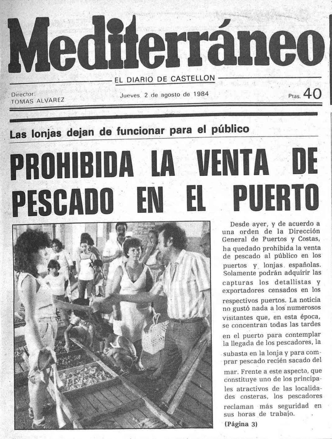 Una decisión del Ministerio de Agricultura y Pesca prohíbe, desde el 1 de agosto de 1984, la venta de pescado de forma directa al público en los puertos y lonjas españolas. La noticia, según recoge Mediterráneo al día siguiente en su portada, «no gustó nada a los numerosos visitantes que, en esta época, se concentran todas las tardes en el puerto para contemplar la llegada de los pescadores», seguida de la subasta.