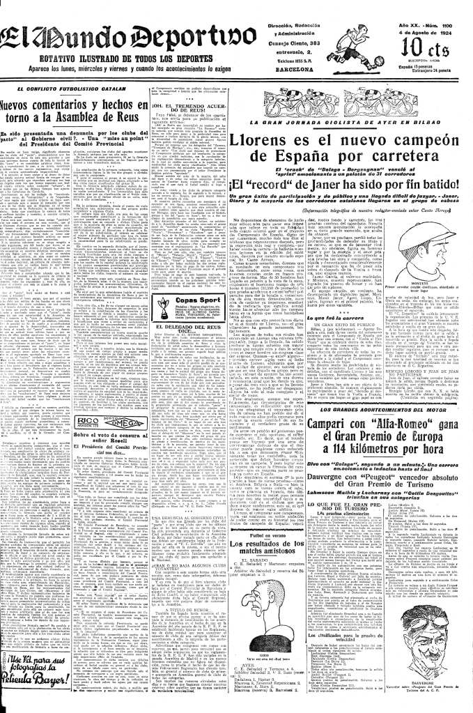 Tres horas, seis minutos y dieciséis segundos es el tiempo empleado por el vila-realense Juan Bautista Llorens Albiol para cubrir los 100 km del XXIV Campeonato de España de Ciclismo en Ruta, que tiene lugar en Bilbao el 3 de agosto de 1924. Con un breve telegrama («Bilbao.- Llegado primero. Campeón de España. Llorens») se recibe la noticia en su tierra natal, como recoge al día siguiente Heraldo de Castellón.