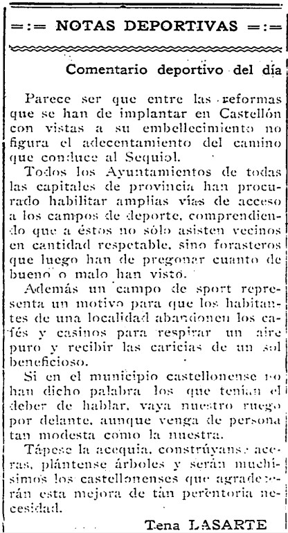 El estado de la actual calle Herrero es, a finales de los años 20, objeto de atención en esta noticia del Diario de la Mañana. Y es que el periódico lamenta que «el adecentamiento del camino que conduce al Sequiol», donde disputa sus partidos el CD Castellón, no figura entre las reformas previstas para el «embellecimiento» de la ciudad. Aparte del argumento de la cantidad de «forasteros» que acuden junto a los vecinos a presenciar los espectáculos deportivos, las líneas que firma Tena Lasarte en el diario recuerdan que «un campo de sport representa un motivo para que los habitantes de una localidad abandonen los cafés y casinos para respirar un aire puro y recibir las caricias de un sol beneficioso».