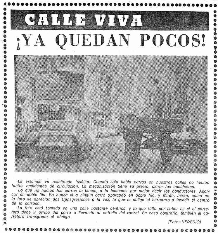 El crecimiento urbano experimentado en las décadas anteriores y la progresiva reducción del peso que la agricultura tiene en la primera mitad del siglo en la economía castellonense se dejan notar, a finales de los 70, en la paulatina desaparición de los vehículos de tracción animal de las calles de la capital. Así, en agosto de 1979 Mediterráneo llama la atención sobre la escasez de carros en su sección Calle viva, en la que subraya que los carreteros no solían aparcar en doble fila, al contrario que los conductores.