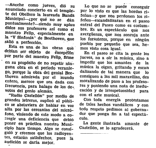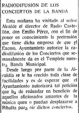 Unas semanas más tarde, las transmisiones de conciertos son toda una realidad, como atestigua Heraldo de Castellón en su edición del viernes 10 de agosto. Entre elogios al maestro Eduardo Felip, director de la banda, el periódico se lamenta porque haya gente que acude «no a oír la música, sino a impedir que los amantes de la música la oigan». Y así, explica que Radio Castellón «por medio de grandes letreros, suplicó al público se abstuviera de hablar en voz alta por las cercanías del micrófono, viniendo de este modo a corregir una deficiencia que debió poner en práctica nuestro Municipio hace tiempo. Algo se consiguió y creemos que los radioyentes estarán satisfechos, pues la audición se daría mejor».