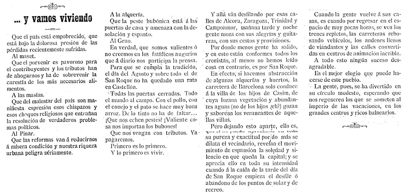Con el título «Y vamos viviendo», Diario de Castellón, publica a mediados de agosto de 1899 un artículo en el que ironiza con la actitud de quienes se refugian de las malas noticias económicas y políticas que amenazan al país huyendo al maset, a las masías, al Pinar, a la alquería o al Grao. «En verdad, que somos valientes o no creemos en los fatídicos augurios que a diario nos participa la prensa», concluye.