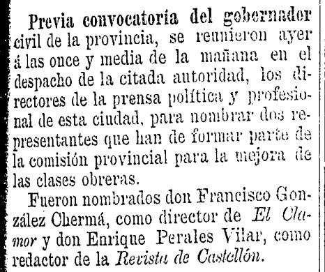 El compromiso de los medios de comunicación está relacionado directamente con su función social, pero no suele ir acompañado de una implicación directa en la gestión de los asuntos públicos. En 1884, sin embargo, una convocatoria del gobernador civil reúne a los directores de la «prensa política y profesional» con el objetivo de nombrar dos representantes que han de formar parte, nada menos, «de la comisión provincial para la mejora de las clases obreras». Así lo cuenta La Defensa, citando a los designados: por un lado, el zapatero y ex alcalde Francisco González Chermá como director de El Clamor y por otro, Enrique Perales Vilar como redactor de la Revista de Castellón.