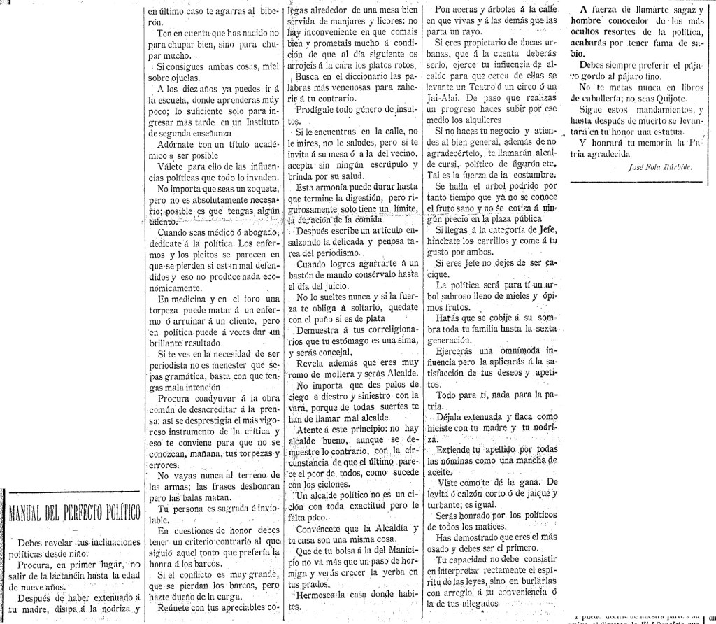A finales de 1894, Diario de Castellón publica en su portada este «manual del perfecto político» del dramaturgo castellonense José Fola Igúrbide, varias de cuyas obras teatrales están disponibles en el repositorio digital de la Universitat Jaume I. Hermano del militar Apolinar Fola, José es como él matemático, además de filósofo e inventor. En su obra se distingue por una literatura marcada por el compromiso social (como muestra, este botón de 1904), y en este artículo despliega una buena muestra de sarcasmo al denunciar la hipocresía en la política… y el periodismo.