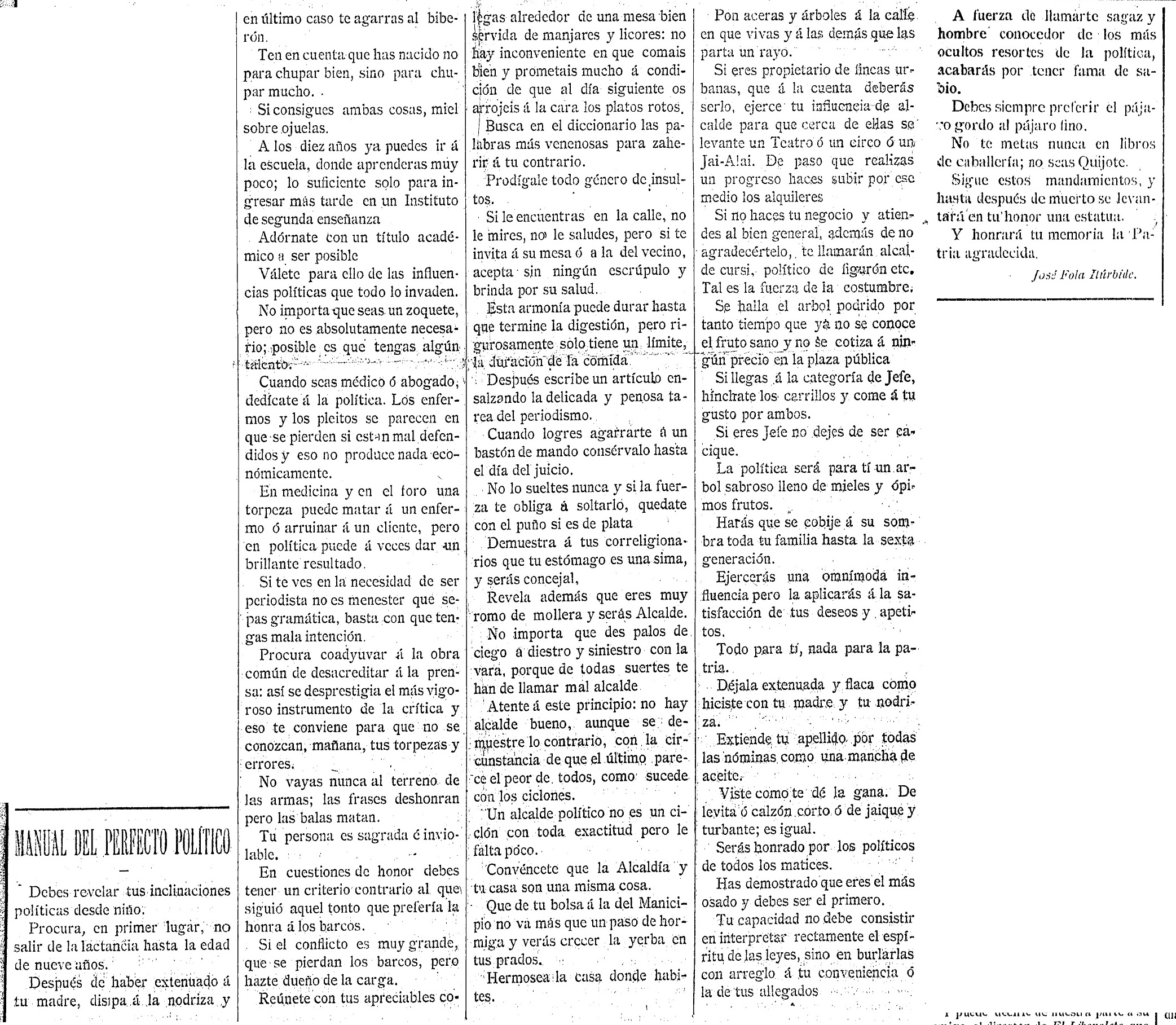 A finales de 1894, Diario de Castellón publica en su portada este «manual del perfecto político» del dramaturgo castellonense José Fola Igúrbide, varias de cuyas obras teatrales están disponibles en el repositorio digital de la Universitat Jaume I. Hermano del militar Apolinar Fola, José es como él matemático, además de filósofo e inventor. En su obra se distingue por una literatura marcada por el compromiso social (como muestra, este botón de 1904), y en este artículo despliega una buena muestra de sarcasmo al denunciar la hipocresía en la política… y el periodismo.