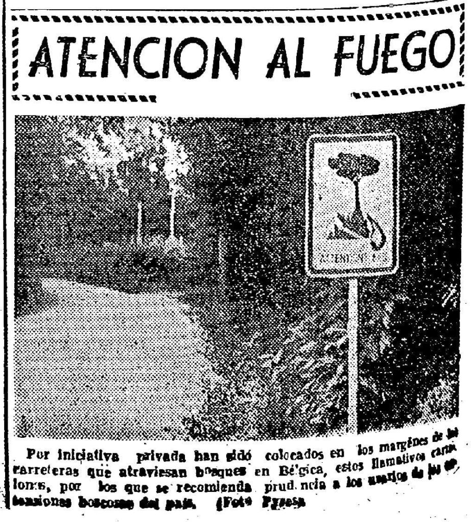 A comienzos de septiembre, Mediterráneo publica esta fotonoticia en la que se da cuenta de una iniciativa «privada» para la instalación de «cartelones» en las carreteras que atraviesan los bosques belgas, recomendando prudencia a los conductores, para evitar que se arrojasen colillas en los márgenes.