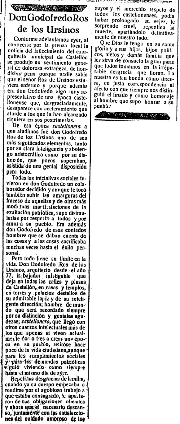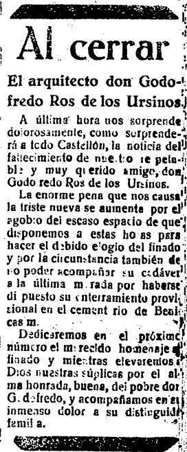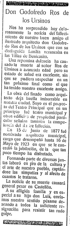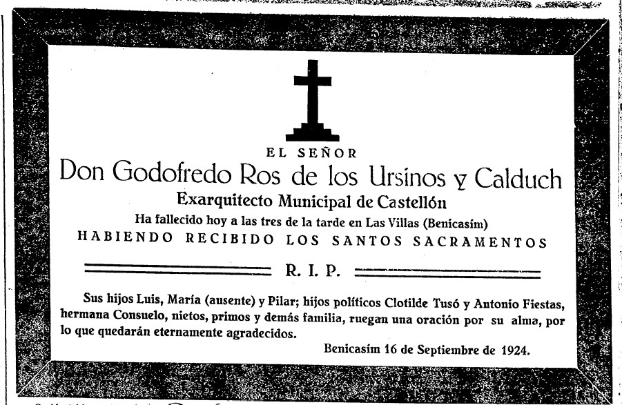 El castellonense Godofredo Ros de Ursinos, arquitecto municipal de la ciudad durante casi medio siglo y creador de espacios como la plaza de la Paz, el Teatro Principal (1894) o la iglesia de la Sagrada Familia (1900) entre otros, fallece repentinamente «a las tres de la tarde» del martes 16 de septiembre de 1924. La noticia es recogida así por Heraldo de Castellón, que se lamenta de no poder asistir a su entierro «por haberse dispuesto su enterramiento provisional en el cementerio de Benicasim»: