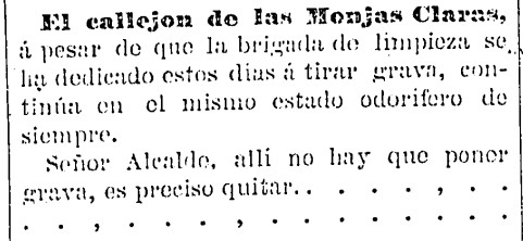 El periódico republicano «bi-semanal» El Clamor informa a sus lectores, a finales de septiembre de 1884, sobre los malos olores en un callejón junto al instituto de la ciudad, cuyo nombre es heredado del antiguo convento de las clarisas allí ubicado. Denuncia el periódico «el mismo estado odorífero de siempre», pese a que la brigada de limpieza «se ha dedicado estos días a tirar grava». Y dirigiéndose al alcalde José Tárrega Torres -médico cirujano para más señas, que desde 1949 dará nombre a la calle Alcalde Tárrega- le aporta su diagnóstico sobre dicho callejón: allí «es preciso quitar…», con unos puntos suspensivos que invitan al lector a completar la frase por su cuenta. Unas semanas antes, el mismo periódico ya había dado signos de su escasa simpatía por el munícipe.