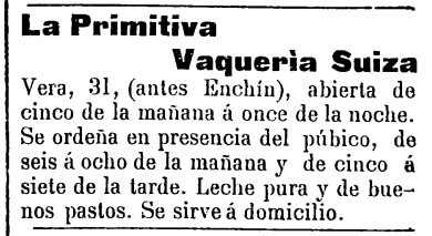 El actual servicio de productos perecederos a domicilio tiene su antecedente histórico en productos básicos como la leche de vaca. Así, con un «se sirve á domicilio», se anuncia a finales de septiembre de 1904, la Vaquería Suiza La Primitiva, ubicada en el número 31 de la céntrica calle Vera, en las páginas de Heraldo de Castellón. «Se ordeña en presencia del público» durante cuatro horas al día, ofreciendo a la clientela «leche pura y de buenos pastos». La empresa destaca además por su amplio horario comercial, de 18 horas diarias.