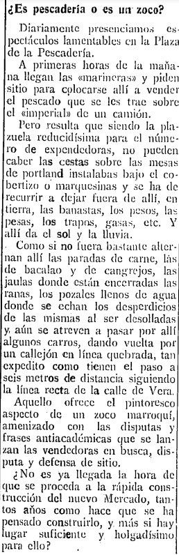 Los «espectáculos lamentables» de la plaza de la Pescadería daban pie a estas líneas publicadas el primer día de octubre de 1929 por Diario de Castellón. La noticia describe la plaza como «reducidísima para el número de expendedoras» y denuncia que las cestas con la mercancía «no pueden caber» sobre las mesas, por lo que buena parte de la misma debe depositarse en tierra. Además, añade, se reúnen en poco espacio también otras paradas «de carne, las de bacalao y de cangrejos» y hasta «las jaulas donde están encerradas las ranas». En definitiva, «aquello ofrece el pintoresco aspecto de un zoco marroquí, amenizado con las disputas y frases antiacadémicas» que se dedican entre sí las vendedoras.