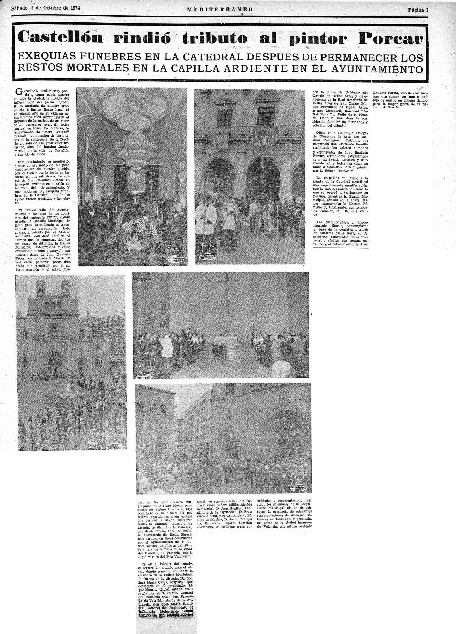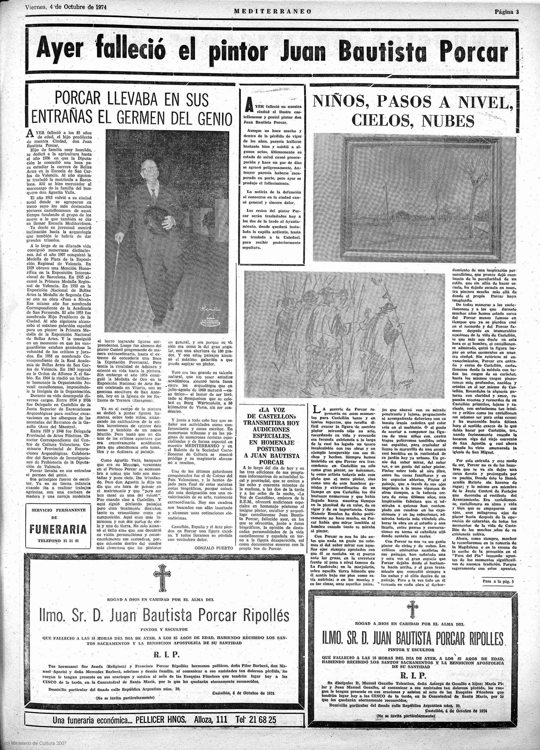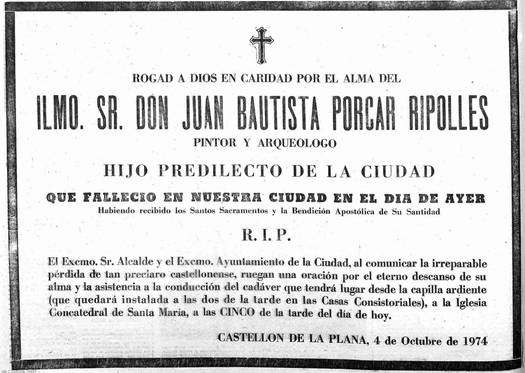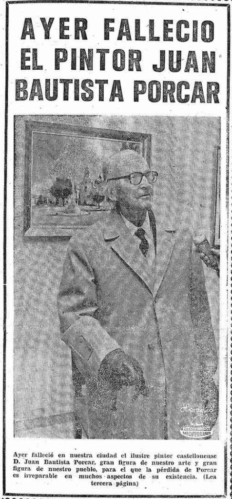 La portada de Mediterráneo se tiñe de luto el primer viernes de octubre de 1974, con el anuncio del fallecimiento del pintor, arqueólogo y escultor Juan Bautista Porcar Ripollés, Hijo Predilecto de la capital de la Plana. Una pérdida «irreparable» para Castellón. La muerte de un protagonista principal del siglo XX en la cultura castellonense es la de una «gran figura de nuestro arte» y de «nuestro pueblo».