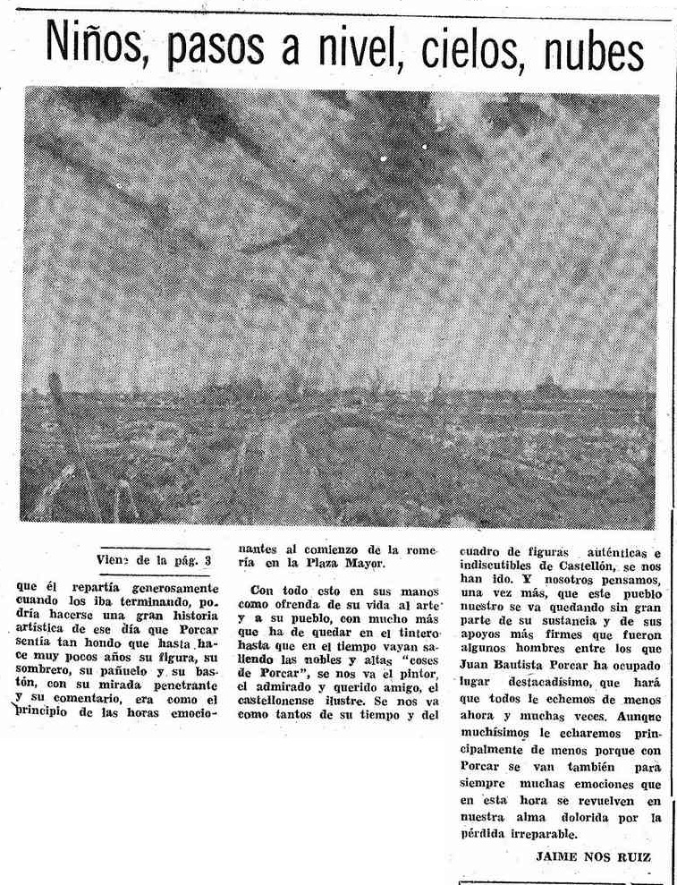 En páginas interiores, el diario destaca que el artista «llevaba en sus genes el germen del genio» y recoge una semblanza del eterno director del periódico, Jaime Nos Ruiz -jubilado en ese mismo año- en alusión a varios de los temas fetiche de Porcar: «Niños, pasos a nivel, cielos, nubes».