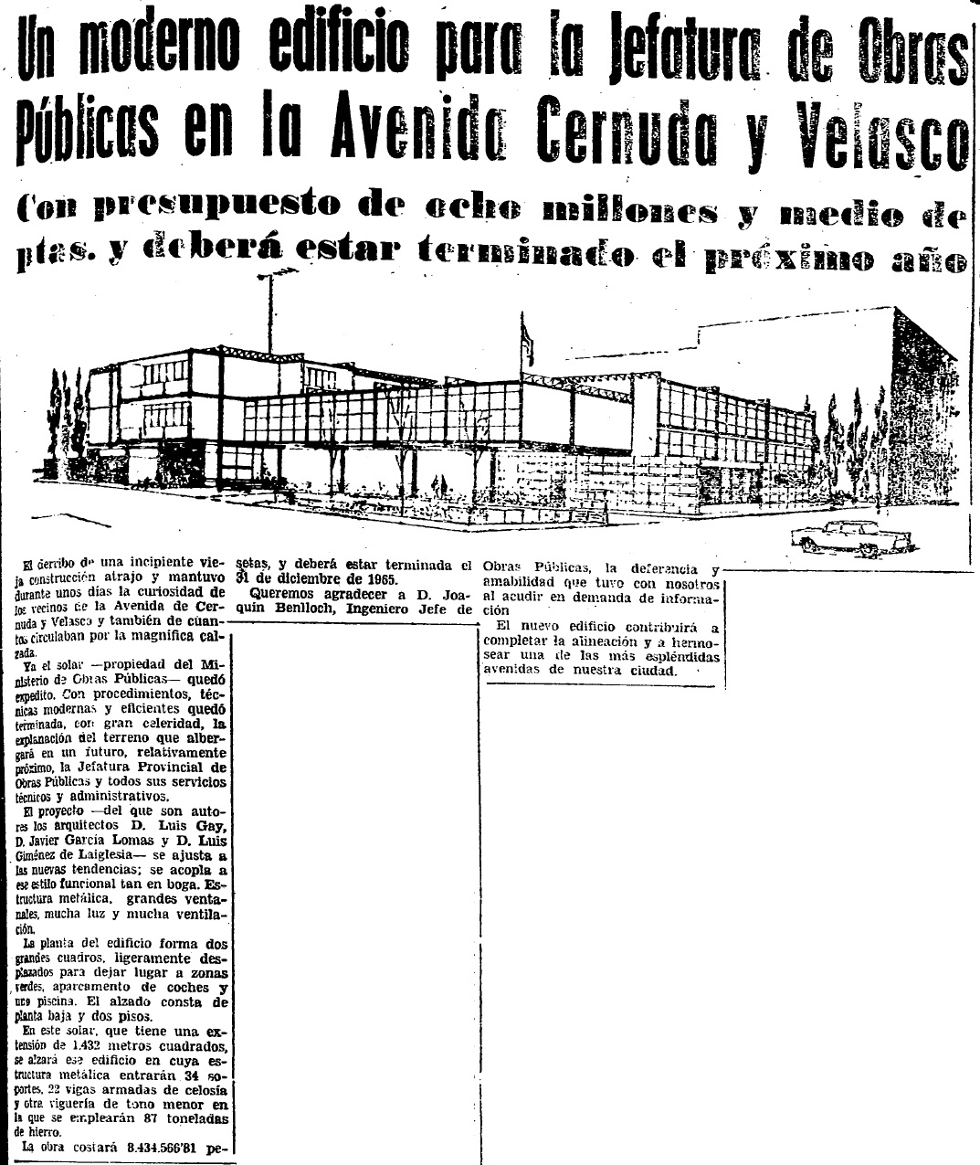 En octubre de 1964, Mediterráneo anuncia la inminente construcción de «un moderno edificio» destinado a la Jefatura de Obras Públicas en la avenida Cernuda y Velasco -hoy avenida del Mar-, con un presupuesto de «ocho millones y medio de ptas.» y fecha de culminación prevista a finales del año siguiente, 1965. En la imagen del diario, se observa una vista general de un proyecto que «se ajusta a las nuevas tendencias», obra de los arquitectos Luis Gay, Javier García Lomas y Luis Giménez de Laiglesia.