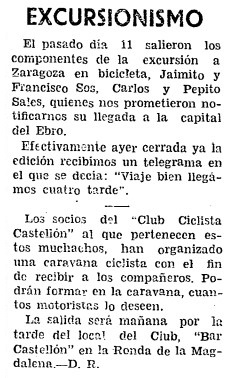 Un jueves de octubre de 1934, el vespertino Heraldo de Castellón informa a sus lectores sobre lo que cataloga como un caso de «excursionismo». Los castellonenses Jaimito Sos, Carlos Sales, Francisco Sos y Pepito Sales saldrán esa misma noche de la ciudad hacia Zaragoza «con objeto de presenciar las típicas fiestas» del Pilar de la capital aragonesa. El periódico destaca que todos tienen «en cartera sus respectivos permisos de circulación rodada» y estima que llegarán a su destino «de dos a tres de la tarde», tras pasar la noche y la mañana pedaleando. Además, el diario explica que los ciclistas «impresionarán» en fotografías «cuantos paisajes bellos se presenten a su alcance».