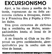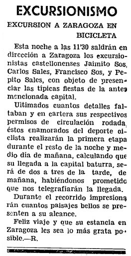 Un jueves de octubre de 1934, el vespertino Heraldo de Castellón informa a sus lectores sobre lo que cataloga como un caso de «excursionismo». Los castellonenses Jaimito Sos, Carlos Sales, Francisco Sos y Pepito Sales saldrán esa misma noche de la ciudad hacia Zaragoza «con objeto de presenciar las típicas fiestas» del Pilar de la capital aragonesa. El periódico destaca que todos tienen «en cartera sus respectivos permisos de circulación rodada» y estima que llegarán a su destino «de dos a tres de la tarde», tras pasar la noche y la mañana pedaleando. Además, el diario explica que los ciclistas «impresionarán» en fotografías «cuantos paisajes bellos se presenten a su alcance».