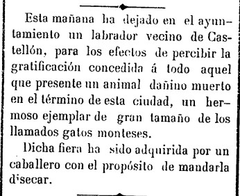 Una mañana de viernes de octubre de 1904, un labrador de la capital de la Plana deposita en el Ayuntamiento «un hermoso ejemplar de gran tamaño de los llamados gatos monteses«. Lo hace, según Heraldo de Castellón, «para los efectos de percibir la gratificación concedida a todo aquel que presente un animal dañino muerto en el término de esta ciudad». El diario especifica que la «fiera» es adquirida por un hombre «con el propósito de mandarla disecar».