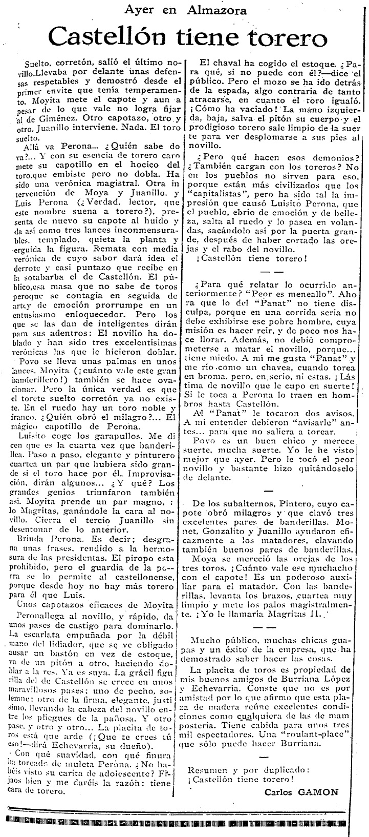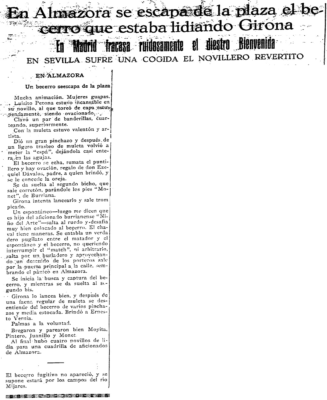 Los lectores del Diario de la Mañana son sorprendidos, a mediados de octubre de 1929, con la noticia de un becerro suelto por el término municipal de Almassora, después de escapar de la plaza en un festejo que cuenta con la participación, entre otros, del novillero castellonense Luis Perona. «Incansable en su novillo», su trabajo es elogiado y se cita entre el público a Ezequiel Dávalos, padre del industrial castellonense de la exitosa fábrica de toquillas ubicada en la calle Herrero, frente al actual hotel Intelier Rosa -antes Intur Castellón.