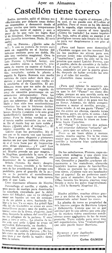 Antes, dos días más tarde de la citada actuación en Almassora, volverá a comparecer con un éxito que será celebrado por el propio Diario de la Mañana con un titular inequívoco: «Castellón tiene torero»:
