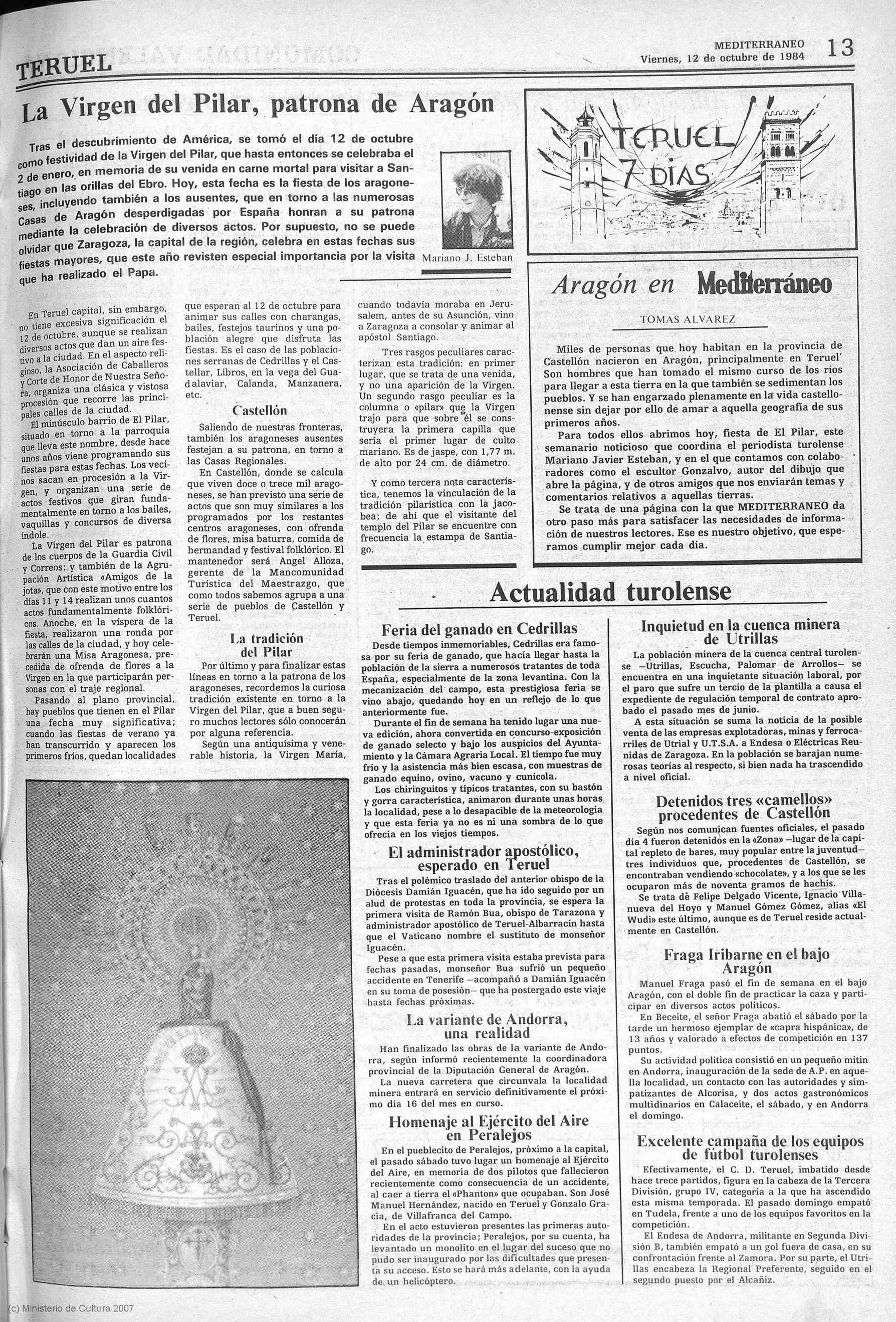 El Día de la Hispanidad de 1984 es especial en Mediterraneo. El diario estrena una sección semanal bajo el título Teruel 7 Días, en la que recogerá informaciones de interés para la colonia turolense en la provincia de Castellón, que ha crecido de forma significativa en las últimas décadas con el éxodo masivo del interior a las grandes ciudades en toda España. El primer titular de la sección es La Virgen del Pilar, patrona de Aragón y la página incluye un artículo del director del diario, el leonés Tomás Álvarez, quien da la bienvenida a la nueva sección y presenta como coordinador de la misma al periodista turolense Mariano Javier Esteban, y como autor de la cabecera al escultor José Gonzalvo Vives.