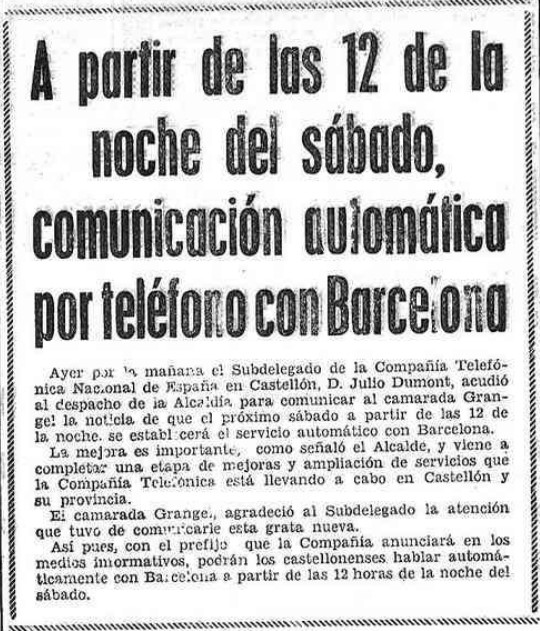 Algo tan cotidiano como una llamada telefónica supone, durante buena parte del siglo XX, la intervención de un telefonista. La operación manual de quienes hacen las labores de interconexión necesarias para completar la llamada es necesaria y la entrada en escena del «servicio automático» se implementa paso a paso. A finales de los años 60, Mediterráneo anuncia la buena nueva de la «comunicación automática por teléfono con Barcelona», una noticia tan esperada como para merecer la visita del subdelegado de Telefónica, Julio Dumont, al alcalde Francisco Grangel, quien muestra su satisfacción por la novedad. Como puede observarse en la noticia, solo unos días antes de que se pusiera en marcha el nuevo servicio, aún se desconoce cuál será el prefijo que se deba utilizar para contactar con la capital catalana.