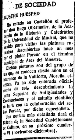 El 26 de octubre de 1934, Diario de Castellón informa sobre la presencia en Castellón del sacerdote, prehistoriador y geólogo Hugo Obermaier y Grad, quien había estudiado ya en 1917 las pinturas rupestres del barranco de la Valltorta, en Tírig. En este caso, se daba cuenta de su estancia «para visitar las pinturas rupestres descubiertas hace un mes por el pintor Porcar en el término municipal de Ares del Maestre», refiriéndose a la Cova Remigia, que en 1998 será catalogada como Patrimonio de la Humanidad por la Unesco junto con otros hallazgos arqueológicos del Arco Mediterráneo.