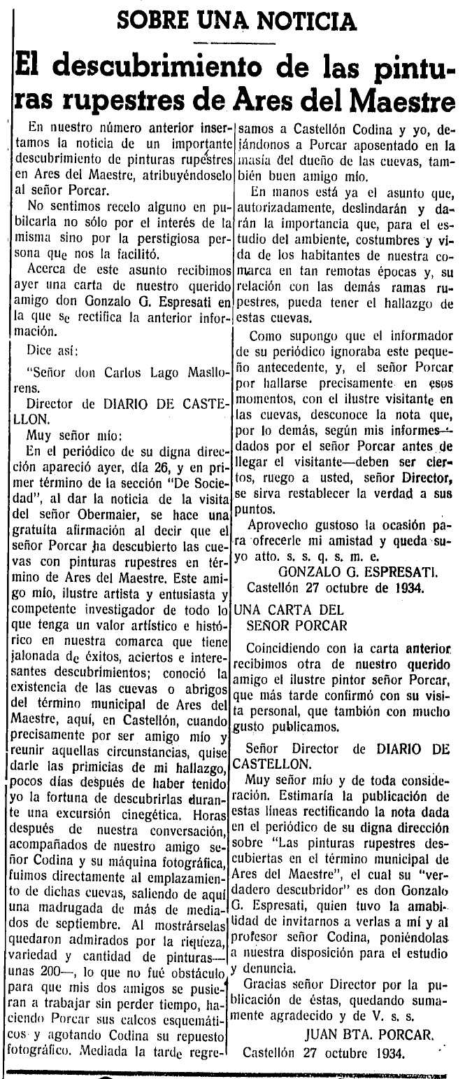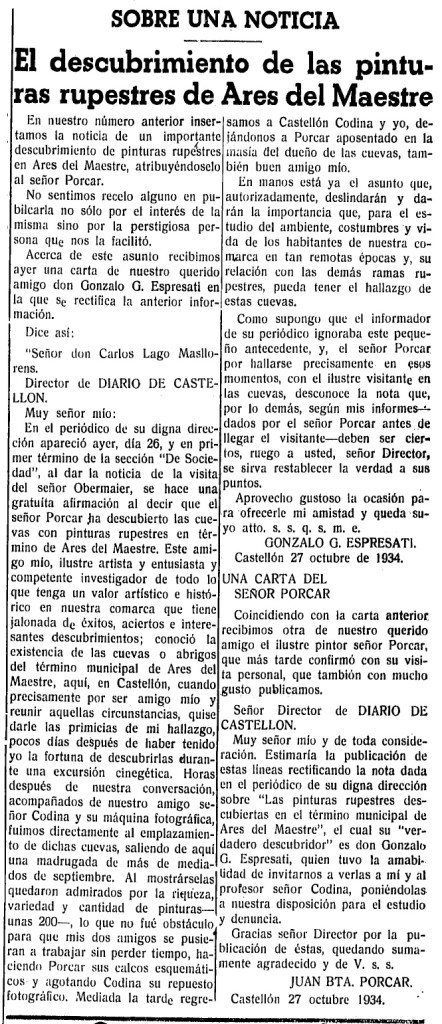En cualquier caso, dos días después de la noticia citada, el propio Diario de Castellón se hace eco de sendas cartas remitidas a su director, Carlos Lago, por González-Espresati y el propio Juan Bautista Porcar. En ambas, se atribuye al primero el «descubrimiento» de las pinturas. En su carta, el propio González-Espresati explica cómo Porcar y Codina habían quedado «admirados por la riqueza, variedad y cantidad de pinturas -unas 200-, lo que no fue obstáculo para que mis dos amigos se pusieran a trabajar sin perder tiempo, haciendo Porcar sus calcos esquemáticos y agotando Codina su repuesto fotográfico»:
