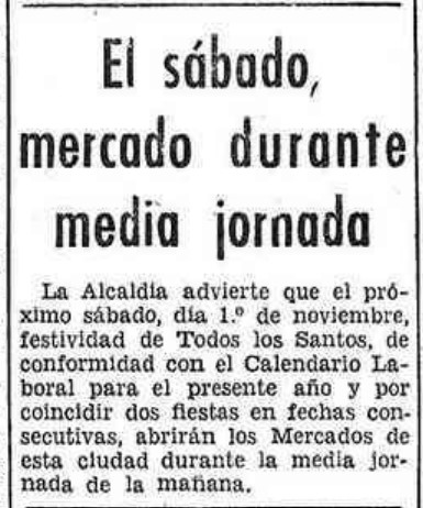 En vísperas de la festividad de Todos los Santos de 1969, el alcalde Francisco Grangel anuncia a través de Mediterráneo que «por coincidir dos fiestas en fechas consecutivas» -sábado 1 de noviembre y domingo 2-, en la primera de dichas jornadas «abrirán los Mercados de esta ciudad durante la media jornada de la mañana», de forma excepcional.