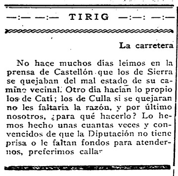 «Preferimos callar». Esa es la conclusión del corresponsal del castellonense Diario de la Mañana en Tírig el día de Todos los Santos de 1929. Poniendo el ejemplo de los vecinos de la Sierra Engarcerán, Catí o Culla, que transmiten en esos días las reivindicaciones de arreglo de sus caminos, en el periódico se dicen «convencidos de que la Diputación no tiene prisa o le faltan fondos para atendernos».