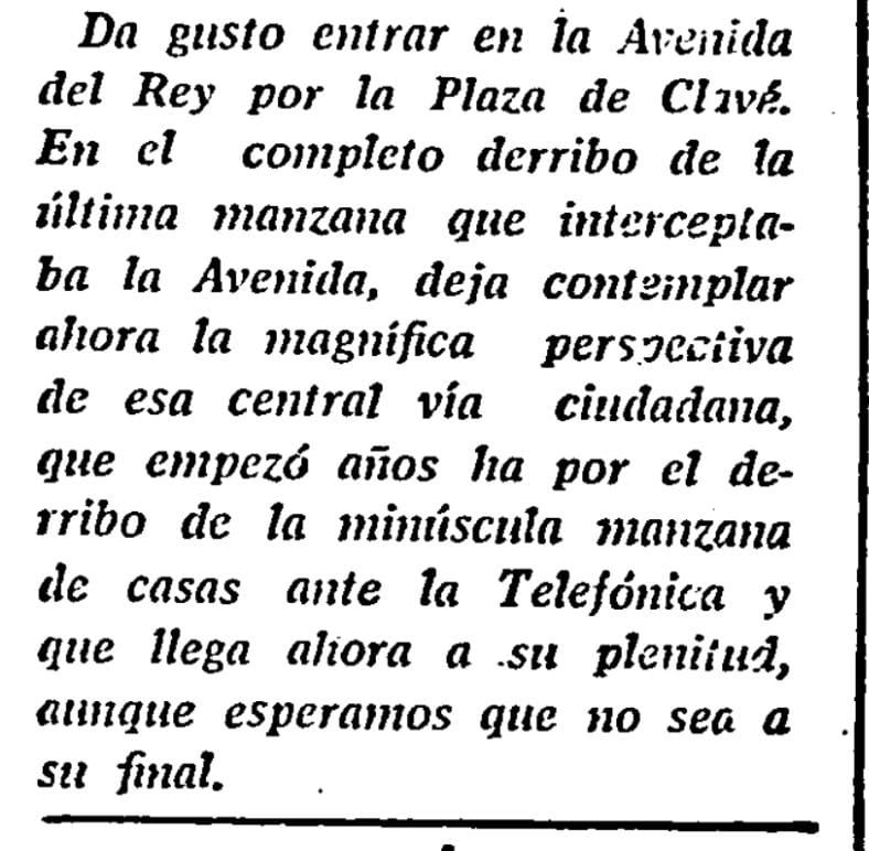 «El completo derribo de la última manzana que interceptaba la avenida» Rey don Jaime «deja contemplar ahora la magnífica perspectiva de esa central vía ciudadana». Así celebraba Mediterráneo, a comienzos de noviembre de 1964, los avances de una de las reformas urbanas más importantes de la época: