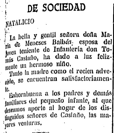 El 10 de noviembre de 1929, Diario de Castellón da noticia del nacimiento de «un hermoso niño», hijo del teniente de Infantería Tomás Castaño y de María de Meneses. El buen estado de madre e hijo es la primera noticia en prensa de la vida de un castellonense que dará mucho que hablar, especialmente en 1964, cuando obtendrá el título de campeón mundial de vuelo acrobático. Tomás Castaño de Meneses nace en el número 3 de la plaza de la Independencia, en el mismo año en que se instala allí la popular Farola de Francisco Maristany.