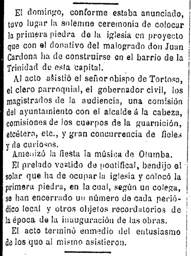 A comienzos de noviembre de 1894, El Clamor de Castellón publica la noticia de la colocación, «conforme estaba anunciado», de la primera piedra de la iglesia de la Trinidad «con el donativo del malogrado don Juan Cardona» Vives. Al acto asiste el obispo de Tortosa, Pedro Rocamora García junto al clero parroquial, el gobernador Tomás Pérez Pérez y el Ayuntamiento «con el alcalde [Eliseo Soler Breva] a la cabeza».