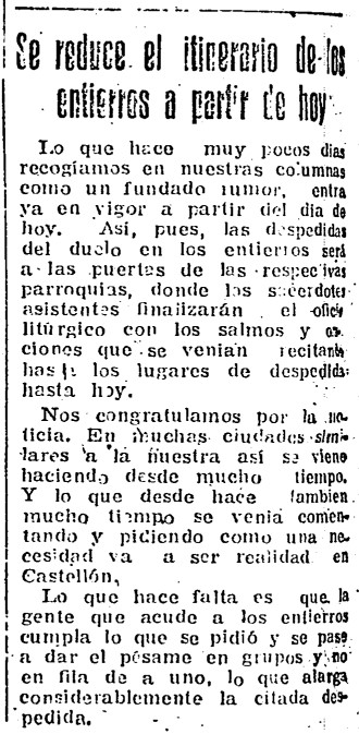 A mediados de noviembre de 1959, Mediterraneo da cuenta de la noticia que unos días antes ya es «un fundado rumor»: el acortamiento del itinerario de los entierros, que a partir de entonces se producirá «a las puertas de las respectivas parroquias, donde los sacerdotes asistentes finalizarán el oficio litúrgico». Se trata de evitar el desplazamiento de los fieles hasta «los lugares de despedida» de costumbre hasta el momento, el más significativo de los cuales era la actual plaza Clavé, conocida como el descarregador de la llenya, camino del camposanto.