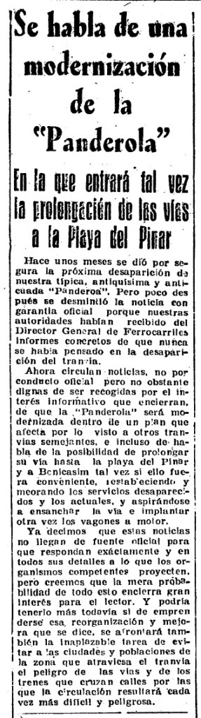 En la segunda página de la edición de Mediterráneo correspondiente al 20 de noviembre de 1959, el periódico publica «noticias [recibidas] no por el conducto oficial pero no obstante dignas de ser recogidas por el interés informativo que encierran, de que la Panderola será modernizada dentro de un plan que afecta por lo visto a otros tranvías semejantes». Entre otras posibles novedades, «se habla de la posibilidad de prolongar su vía hasta la playa del Pinar y a Benicasim tal vez si ello fuera conveniente, restableciendo y mejorando los servicios desaparecidos y los actuales, y aspirándose a ensanchar la vía e implantar otra vez los vagones a motor».