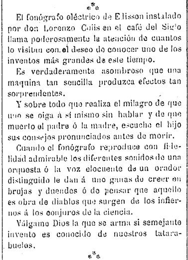 Thomas Alva Edison anuncia en 1877 la invención de su fonógrafo y ese mismo año lo patenta. El dispositivo reúne bajo un mismo principio la grabación y la reproducción sonora. Siete años después, en 1884, el fonógrafo instalado en el café del Siglo de Castellón «llama poderosamente la atención de cuantos lo visitan con el deseo de conocer uno de los inventos más grandes de este tiempo», según esta noticia publicada por El Clamor. El cronista se maravilla porque «una máquina tan sencilla produzca efectos tan sorprendentes», como «el milagro de que uno se oiga a sí mismo sin hablar». «Le dan ganas a uno de creer en brujas y duendes», añade, antes de concluir: «Válgame Dios la que se arma si semejante invento es conocido de nuestros tatarabuelos».