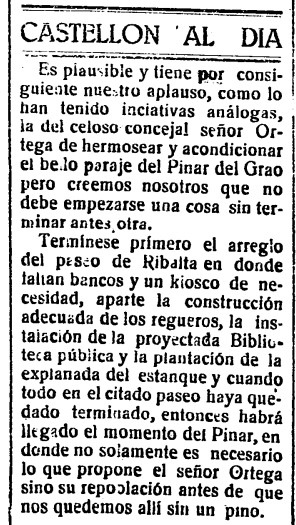 A finales de noviembre de 1924, Heraldo de Castellón envía su «aplauso» al «celoso concejal» Vicente Ortega Gracia, quien ha anunciado su propósito de «hermosear y acondicionar el bello paraje del Pinar del Grao» para, a continuación, recordarle que antes tiene otros deberes pendientes con el Parque Ribalta. De este modo, el periódico insta al Ayuntamiento presidido por Francisco Ruiz Cazador a «terminar» en el principal espacio verde de la ciudad «bancos y un kiosco de necesidad, aparte la construcción adecuada de los regueros, la instalación de la proyectada Biblioteca pública y la plantación de la explanada del estanque». Y cuando todo ello esté realizado, «entonces habrá llegado el momento del Pinar», para el cual sugiere que además de la propuesta del concejal es necesaria «su repoblación antes de que nos quedemos allí sin un pino».