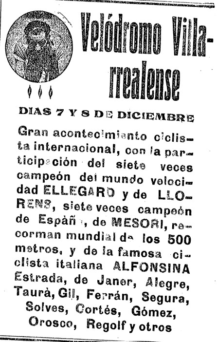 Solo medio año después de ser la única mujer en completar los 3.613 km del Giro de Italia de 1924, la trasalpina Alfonsina Strada es uno de los atractivos de un «gran acontecimiento ciclista internacional» anunciado en el «Velódromo Villarrealense» para los días 7 y 8 de diciembre. Junto a ella, figuran en el cartel que presenta La Provincia Nueva el danés Thorvald Ellegard, «siete veces campeón del mundo [de] velocidad»; el vila-realense Juan Bautista Llorens, por entonces «siete veces campeón de España», y Mesori, «recorman mundial de los 500 metros».