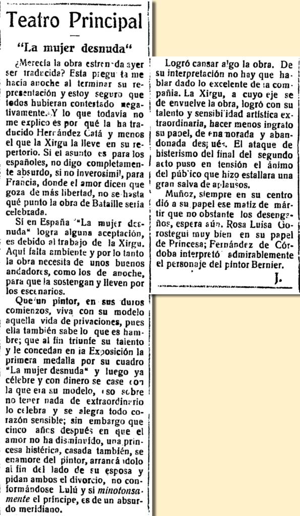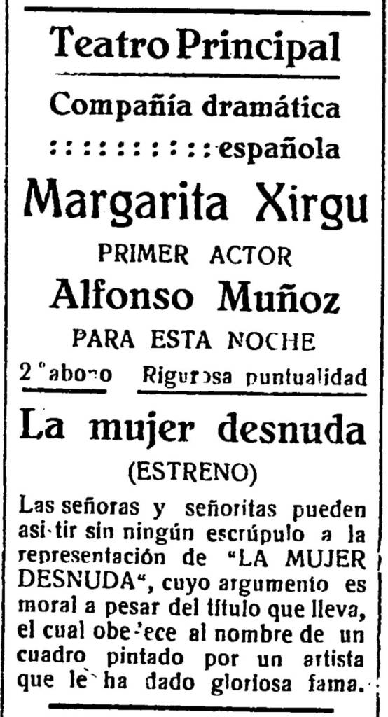 En diciembre de 1924, la actriz catalana Margarita Xirgu se sube a las tablas del Teatro Principal de Castellón con 36 años, para representar con su propia compañía y junto al primer actor riojano Alfonso Muñoz La mujer desnuda, obra del francés Henry Bataille. En el anuncio que publica Heraldo de Castellón se aclara que las señoras y señoritas «pueden asistir sin ningún escrúpulo a la representación», puesto que el argumento de la obra «es moral a pesar del título que lleva».