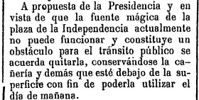 En diciembre, el propio periódico se hace eco de la propuesta del alcalde Joaquín Peris Martí al pleno municipal para la retirada de la citada fuente, que supuestamente combinaría luz y agua, porque «actualmente no puede funcionar y constituye un obstáculo para el tránsito público». El Ayuntamiento decide a favor de su supresión, si bien «conservándose la cañería y demás que esté debajo de la superficie con el fin de poderla utilizar el día de mañana».
