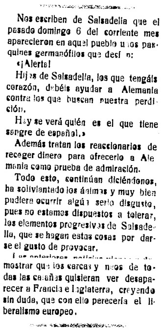 Cuatro meses después del inicio de la I Guerra Mundial, en diciembre de 1914, el impacto del conflicto llega a todos los rincones de una España que se mantiene oficialmente al margen del conflicto. Un ejemplo lo aporta El Clamor el Día de la Inmaculada Concepción, refiriéndose al caso de unos «pasquines germanófilos» aparecidos en el pueblo de la Salzadella, animando a «ayudar a Alemania contra los que buscan nuestra perdición». Según el diario republicano, «tratan los reaccionarios de recoger dinero para ofrecerlo a Alemania como prueba de admiración».
