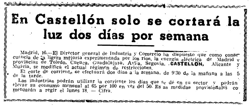 A mediados de los años 40 y en plena autarquía, la alta dependencia energética del país respecto de las centrales hidroeléctricas conlleva importantes dificultades para mantener la regularidad del suministro eléctrico. Así, en una portada de Mediterraneo de vísperas de la Navidad de 1944, se recoge como noticia positiva que en Castellón «solo se cortará la luz dos días por semana», «como consecuencia de la ligera mejoría experimentada por los ríos». Los cortes en la corriente, se anuncia, serán «de 9.30 de la mañana a las 5 de la tarde», con medidas especiales para la industria.