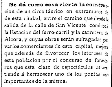 Dos años y medio antes del domingo 3 julio de 1887, fecha de inauguración de la actual plaza de toros de Castellón, El Clamor asegura a sus lectores que «se dá como cosa cierta la construcción de un circo táurico en extramuros de esta ciudad», en concreto «entre el camino que desde la salida de la calle de San Vicente conduce a la Estación del ferro-carril y la carretera de Alcora». Las obras, añade el periódico bisemanal, «serán sufragadas por varios comerciantes de esta capital», en una iniciativa que «tiende a hermosear uno de los puntos más importantes» de la ciudad.