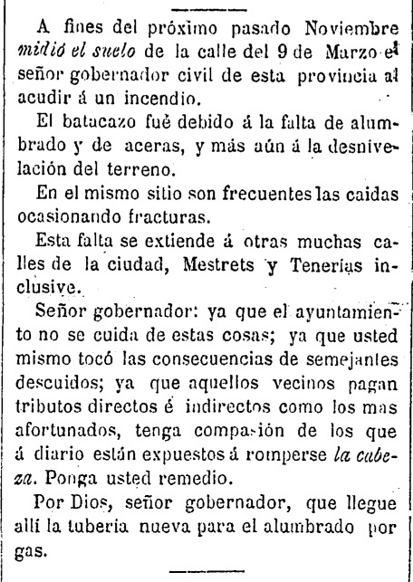 El gobernador Eduardo Caamaño Cotrina es el involuntario protagonista de estas líneas publicadas por El Clamor en vísperas de la Navidad de 1889. El diario recuerda que unos días antes, el poncio «midió el suelo de la calle del 9 de Marzo» mientras acudía «a un incendio». Lo que habría causado el «batacazo» del político sería la falta de alumbrado y de aceras, junto a la «desnivelación» del terreno, un problema extendido a «otras muchas calles de la ciudad, Mestrets y Tenerías inclusive».
